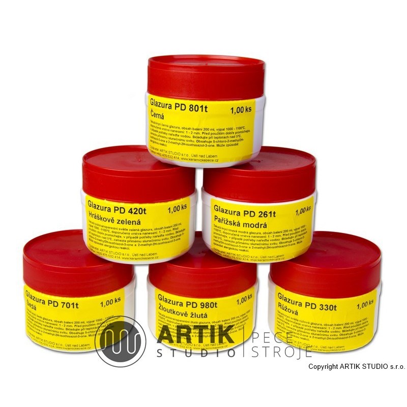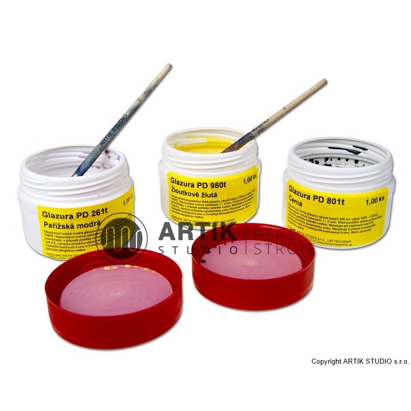 Tekuté glazury PK jsou baleny po 200 ml v neprůhledných dózách s dodatečným vnitřním víčkem. Obal je opatřen etiketou s doporučeným postupem individuálně ke každé glazuře. Na objednávku pro vás můžeme vyrobit tekutou glazuru ve větších množstvích, např. kbelík 10 litrů (výroba cca. 2 týdny). V případě zájmu prosíme poptejte.