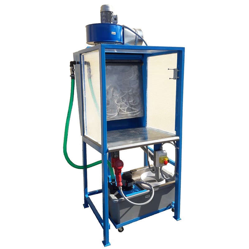 Stříkací kabina GB 100 je navržena tak, aby vyhovovala stále rostoucím požadavkům na ochranu pracovního prostředí stejně tak jako životního prostředí. Vodní tryska funguje na principu nepřetržité clony z recyklované vody. Při stříkání glazur se míří směrem na tuto vodní clonu, jemný aerosol je odtahován výkoným ventilátorem, samotná glazura je zachycena vodní clonou, zatímco proud vzduchu je tažen skrz kabinu do omyvatelného předfiltru a nakonec je zaveden do odtahu mimo dílnu. Alternativně můžeme dodat variantu, kdy odtah je umístěn do nádoby s vodou a není tak nutné napojení na externí odtah. Toto řešení je vhodné pro méně intenzivní používání z důvodu čištění. Přebytečná glazura se smývá v nádrži a může být později znovu použita v závislosti na typu a barvě glazury. Veškeré glazurové materiály lze tak bezpečně separovat a zlikvidovat v souladu s předpisy pro komunální odpady. Glazovací box GB 100 je primárně navržen pro použití v ateliérech hrnčířství a vzdělávacích fakultách pro nízko-objemovou výrobu.