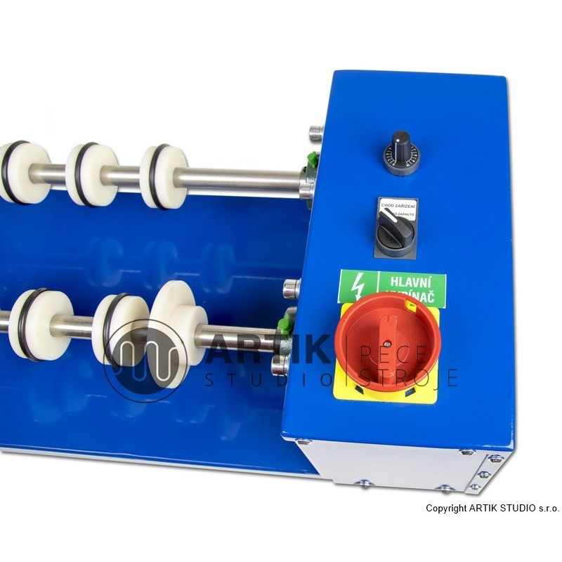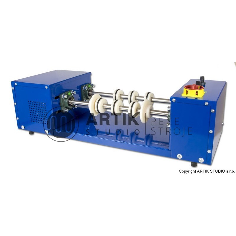 Kulový mlýn KM 01/R je koncipován jako stolní model a pojme jednu mlecí nádobu velikosti 1 – 4 litry. Mlýn nabízí vynikající poměr cena/výkon a je určen pro provoz v menších dílnách a laboratořích. Je opatřen gumovými nožičkami a se svou hmotností okolo 30 kg (bez nádoby) je při práci stabilní a relativně tichý. KM 01/R je standardně vybaven plynulou regulací otáček v rozmezí 130 – 270 otáček za minutu (rpm). Čím vyšší otáčky nastavíte, tím rychleji bude mletí probíhat, ale také vznikat více tepla a mlecí nádoby a tělesa se budou více opotřebovávat. Regulace je řešena prostřednictvím osvědčeného frekvenčního měniče. Celá konstrukce mlýnu je ošetřena odolným průmyslovým strukturním lakem. Mlýn je navržen pro používání s mlecími nádobami průměrů 140 – 250 mm. Šíře válců jsou plynule nastavitelné podle vnějšího průměru použité nádoby. Boční dorazy lze libovolně pozicovat s ohledem na vnější délku mlecí nádoby.